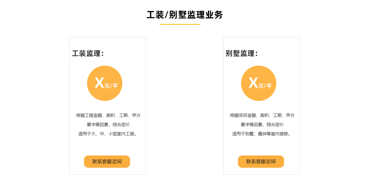 工装和别墅的监理服务,可根据业主的需求进行定制,用科学、完善的流程和严谨、细致的检查过程覆盖了整个装修阶段的所有关键工序; |